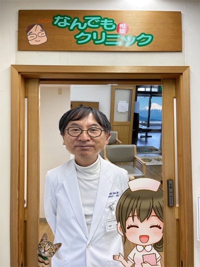 私、院長の福本純雄は、診療全般を担当することから、 「なんでもや福ちゃん」とよばれています。 患者の皆さんの元気な笑顔がこのまちにいつもあふれていたらいいな、 そんな想いをこめてSAGAなんでも相談クリニックをオープンさせました。 体や心についてのどんな小さな悩みもまるで家族に相談するかのように 気軽に私たちに相談してください。お待ちしています。